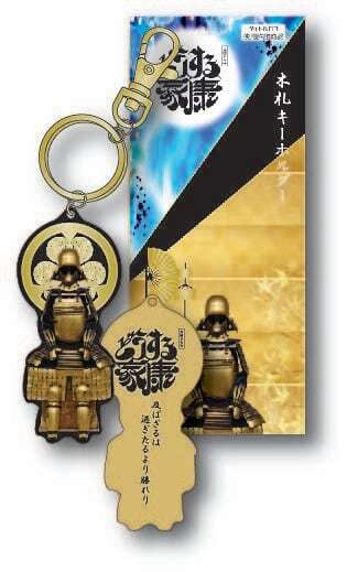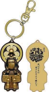 タイトルロゴ使用許諾商品。木札の素材を生かした軽い根付。「どうする家康」公タイトルロゴ+「金屏風」+徳川家紋+「金溜塗具足」を配置した完全オリジナルデザイン。素材:木札+レーザーカット+UV印刷/台紙+OPP包装/H50mm/台紙サイズ:130×55m/日本製